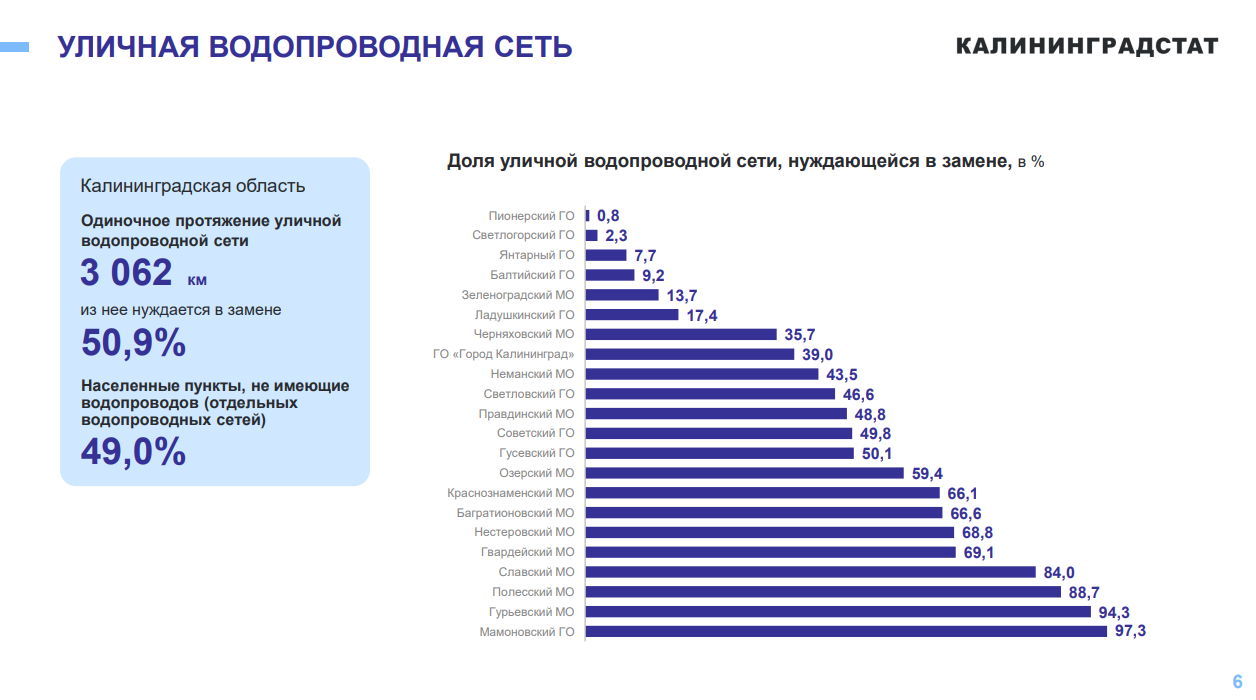 Самая высокая степень износа зафиксирована в Мамоновском, Гурьевском, Полесском и Славском округах — там замены требует от 80% до 100% сетей. Лучше всего ситуация выглядит в Пионерском и Светлогорском округах, где доля изношенных сетей минимальна.