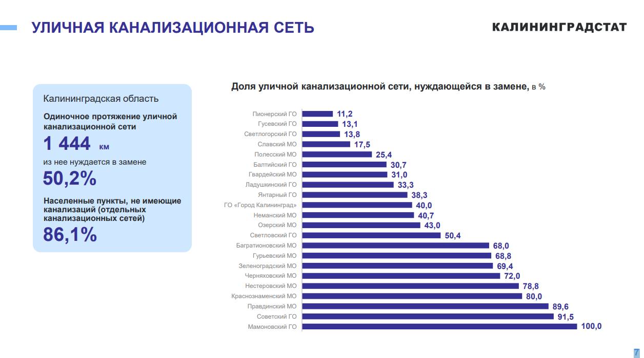 Самая высокая степень износа зафиксирована в Мамоновском, Гурьевском, Полесском и Славском округах — там замены требует от 80% до 100% сетей. Лучше всего ситуация выглядит в Пионерском и Светлогорском округах, где доля изношенных сетей минимальна.