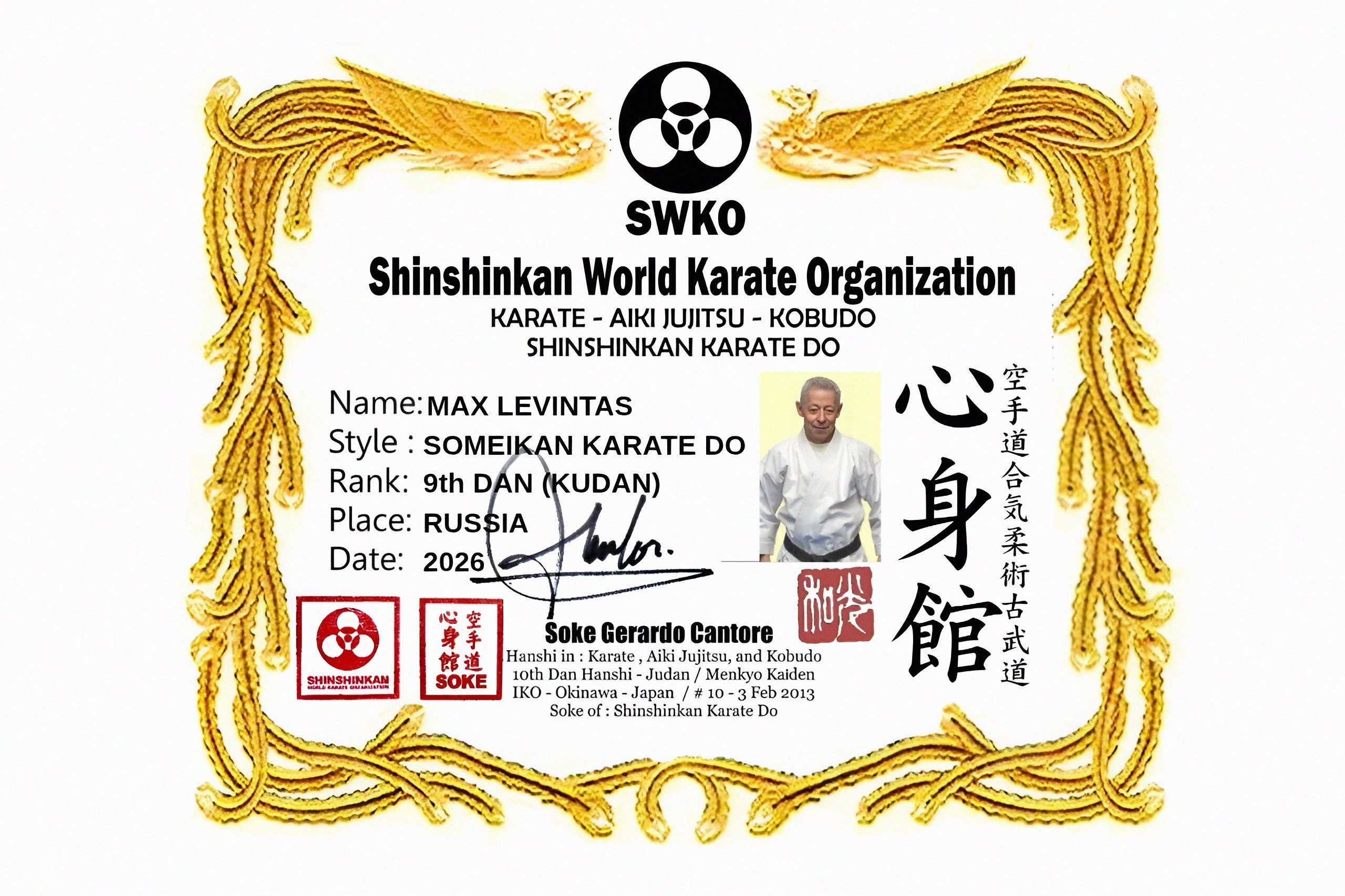 30 марта 2026 года Всемирная организация каратэ Шиншинкан присвоила калининградскому мастеру Максу Левинтасу высокий 9-й Дан — это один из самых почётных уровней в каратэ.