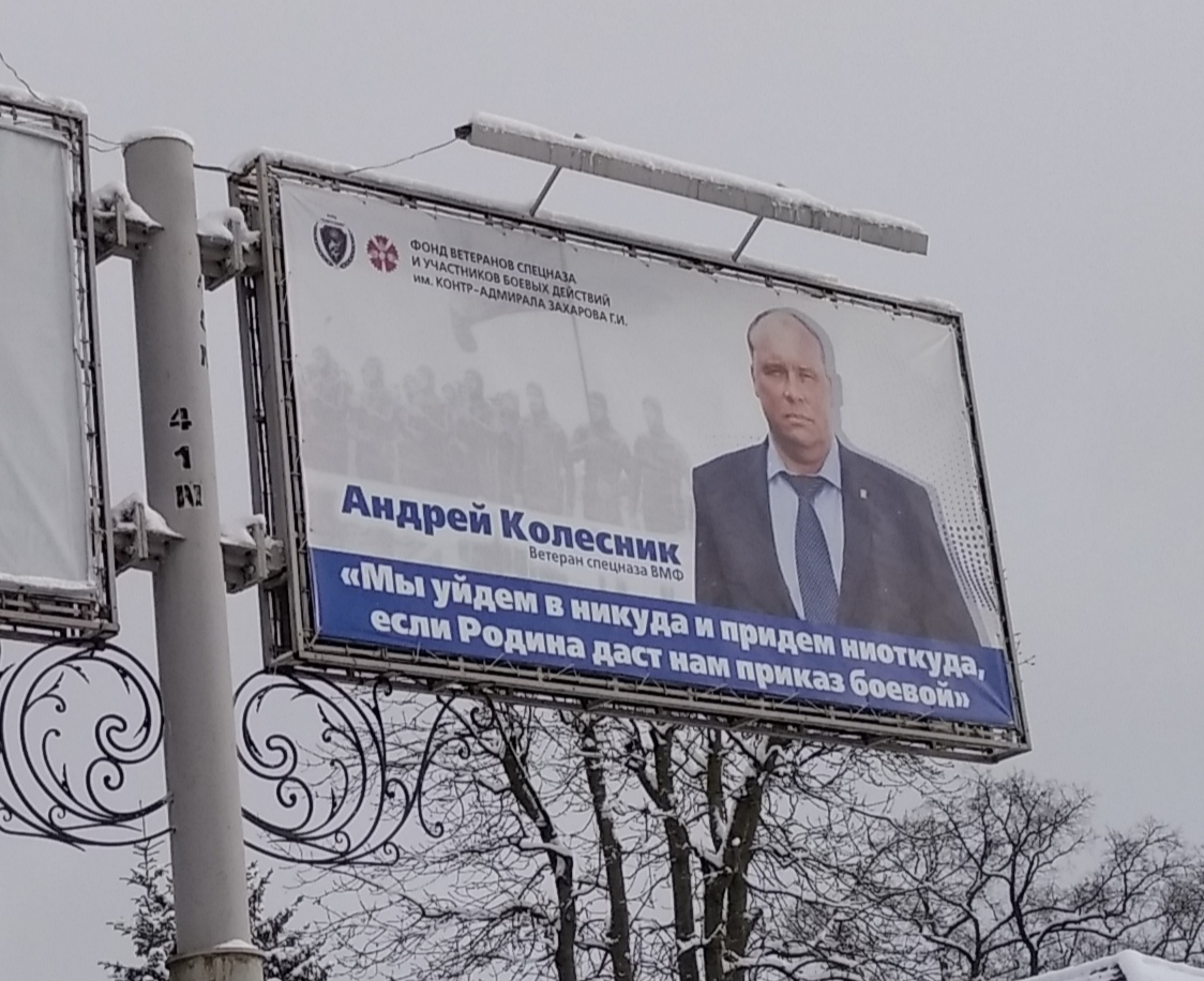 Депутат Калининградской областной Думы Андрей Колесник объяснил в эфире «Балтик Плюс», что значит фраза «Мы уйдем в никуда и придем ниоткуда, если Родина даст нам приказ боевой». Эту надпись жители и гости Калининградской области видят на придорожных баннерах. Как пояснил Андрей Колесник, это слоган одной из частей военной разведки: «Основной слоган военной разведки: «Выше нас только звезды». У воздушно-десантных войск: «Никто кроме нас». Есть определенные группы людей, у которых другой слоган: «Кто угодно, только не мы». Есть слоган морской пехоты: «Где мы – там победа». А есть слоган некоторых наших политиков: «Где победа – там и мы». Ну и, естественно, есть некоторые подразделения – они уходят в никуда и возвращаются ниоткуда. И кто-то там погибает. И в конечном-то итоге подвиги многих из этих ребят так и невозможно опубликовать, хранить вечно». Отвечая своим онлайн оппонентам из социальных сетей, Андрей Колесник отметил, что «дорога в Думу не выстилается этими баннерами». Надписи на них носят воспитательный и патриотический характер.